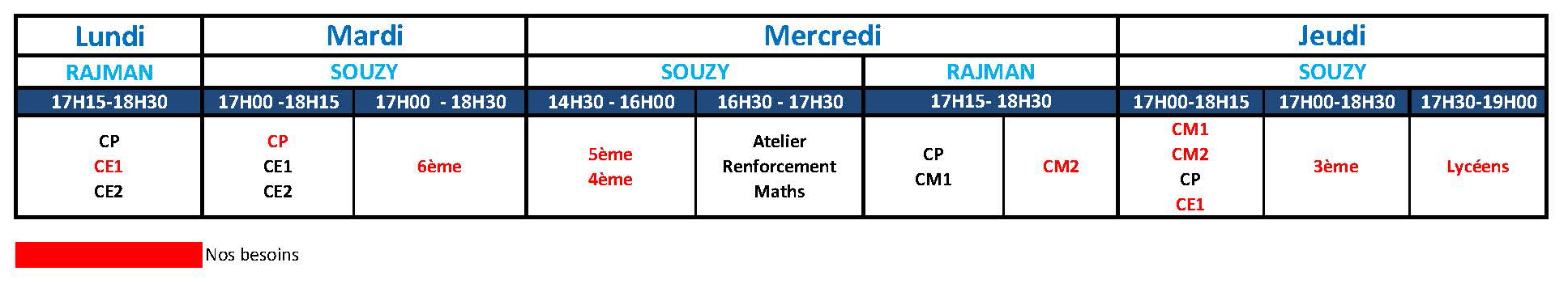 Vous trouverez le planning de l’accompagnement scolaire, les besoins sont notifiés en rouge.