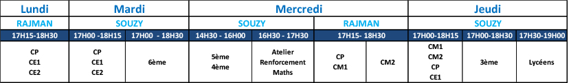 Vous trouverez ci-dessous le planning de l’accompagnement scolaire :